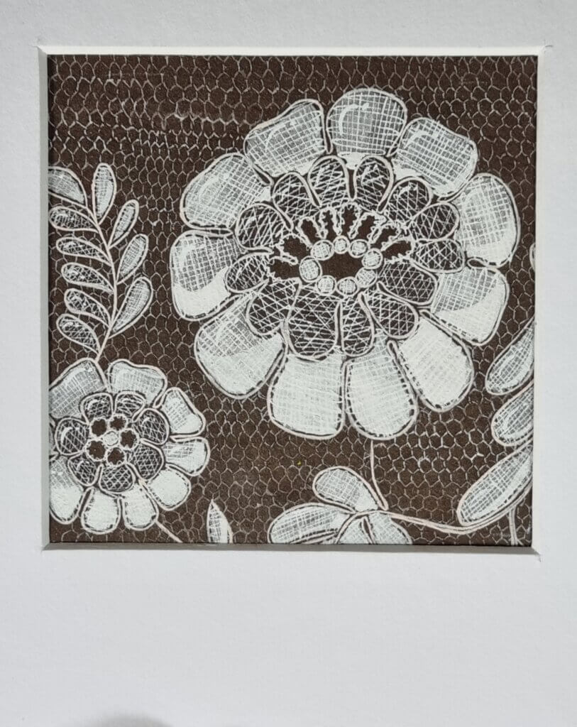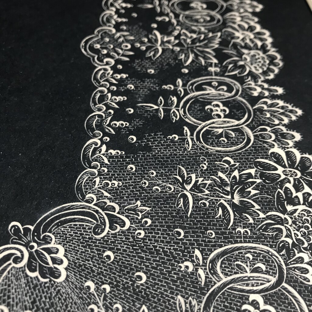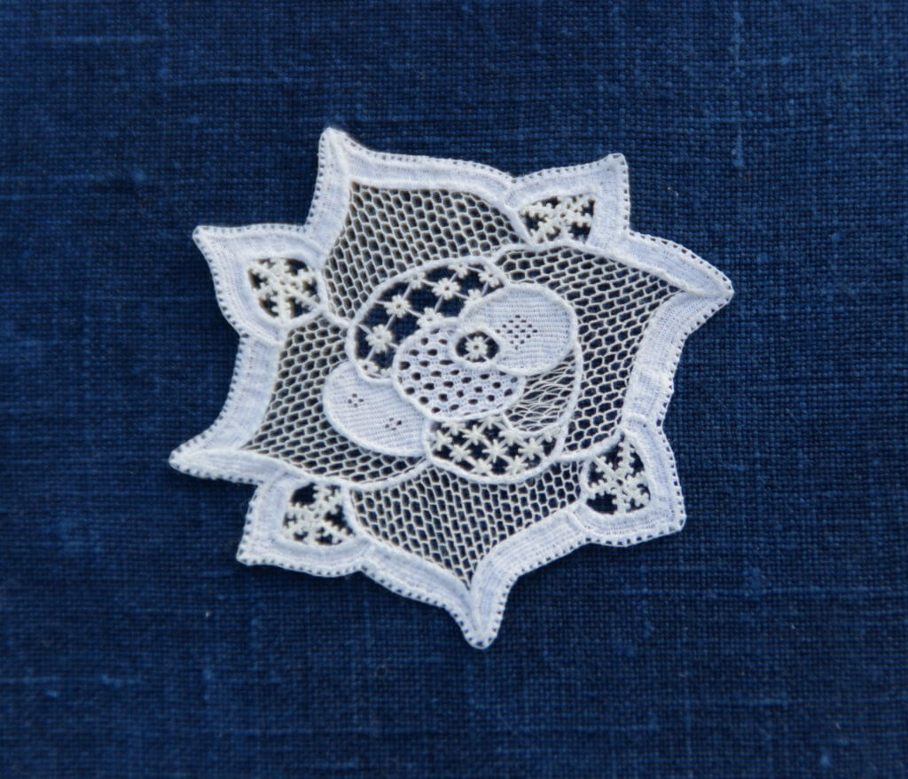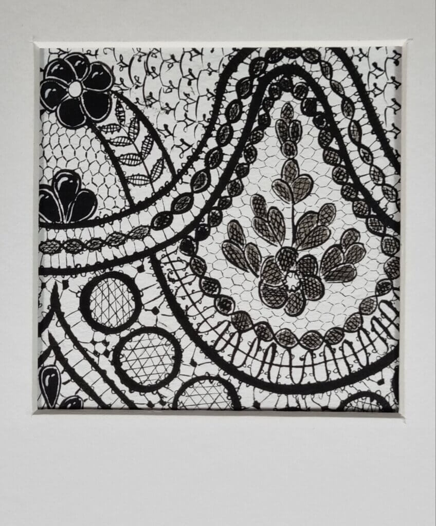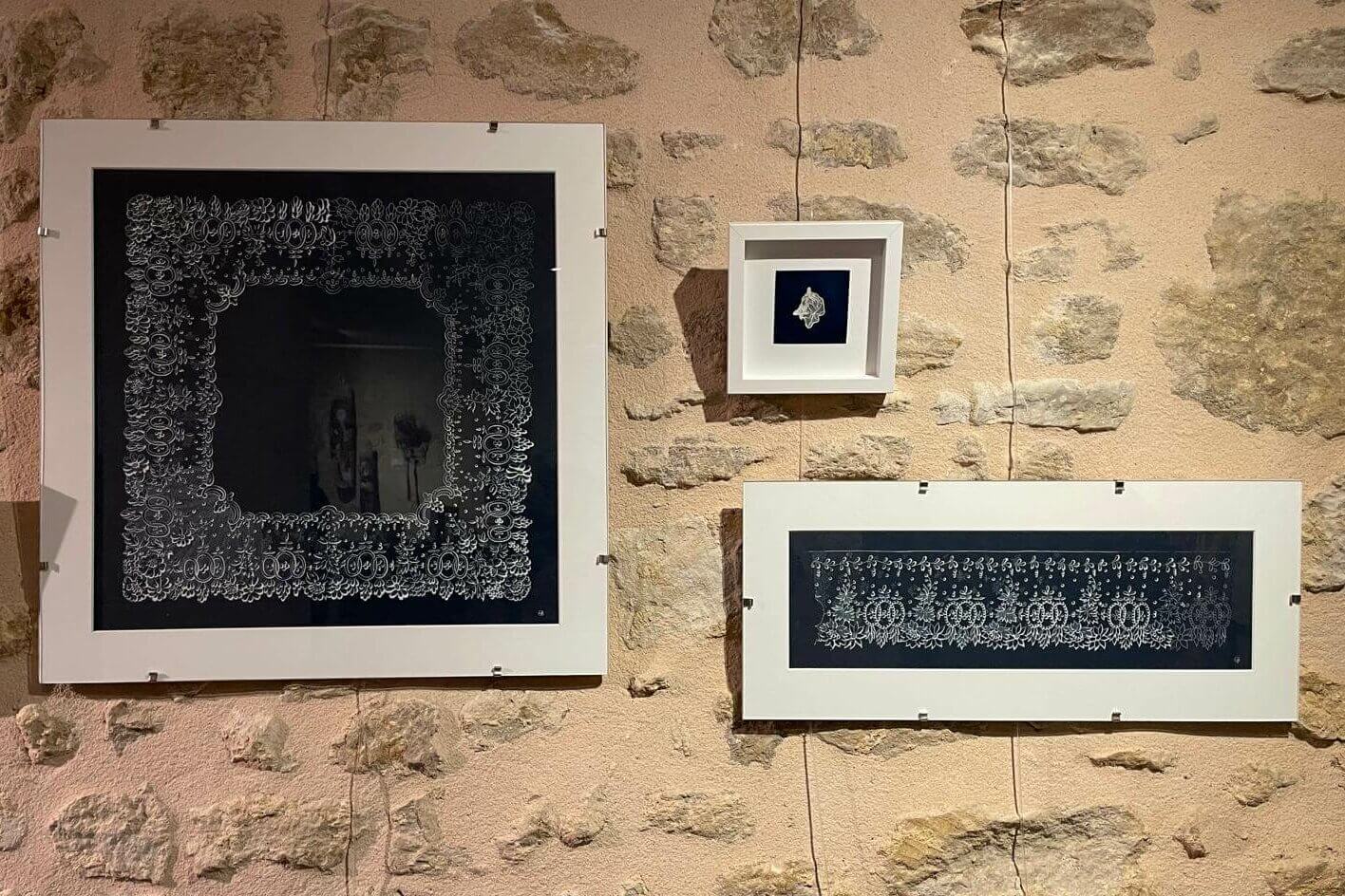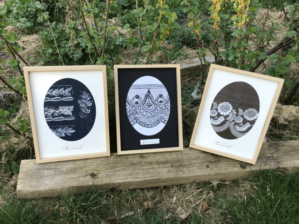 Les dessins sont pour certain des motifs historique issu des archives départementale de l’Orne ou des différentes structures dans lequel j’expose. Soit des créations libres ou inspiré des collections des lieux d’exposition. Tous les éléments de dentelle au point d’Alençon sont entièrement réalisées au sein de l’atelier.