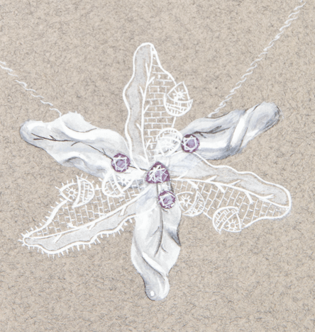 Plongez dans l’élégance que vous offre la dentelle au point d’Alençon. Ces pièces de collection incarnent l’alliance sublime et délicate entre dessin à la gouache et des éléments de dentelle au point d’Alençon.
